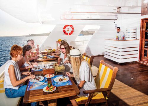 Od otwartego, przestronnego pokładu słonecznego wypełnionego leżakami, przez zacienione wygodne miejsca na środkowym pokładzie, aż po dwa bogato urządzone klimatyzowane pokłady salonowo–jadalne – łodzie ELITE VIP to 4 piętra rozpieszczania, relaksu i przestrzeni.